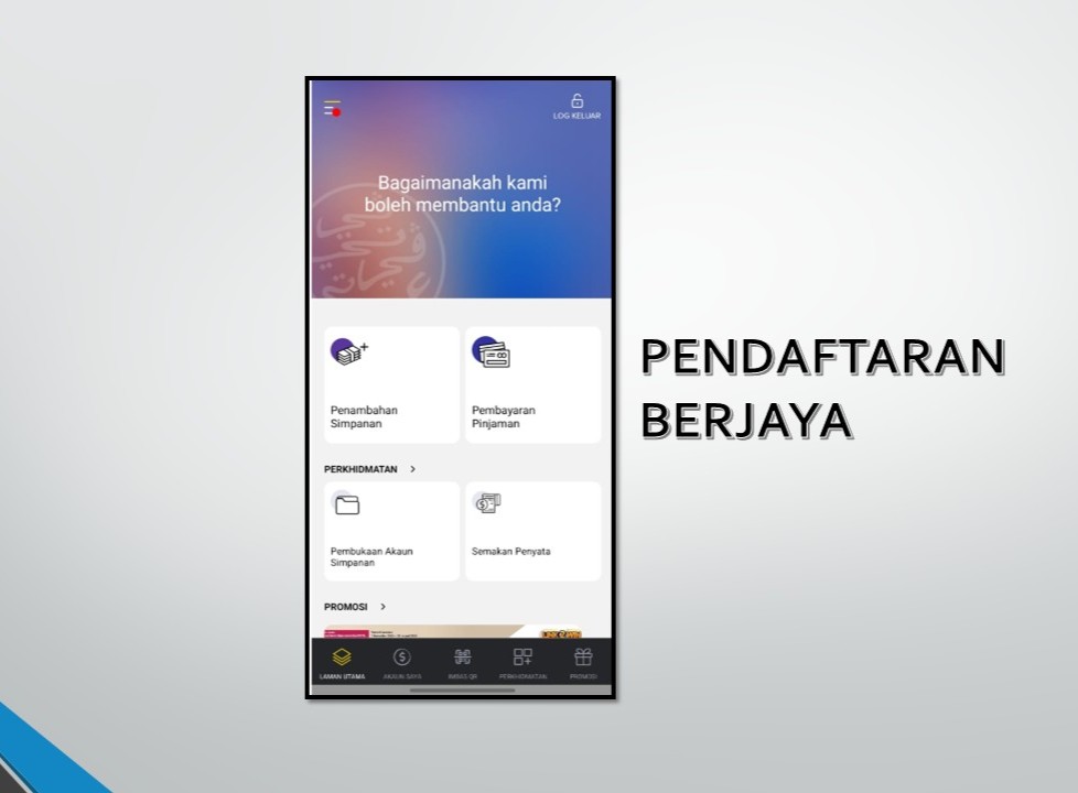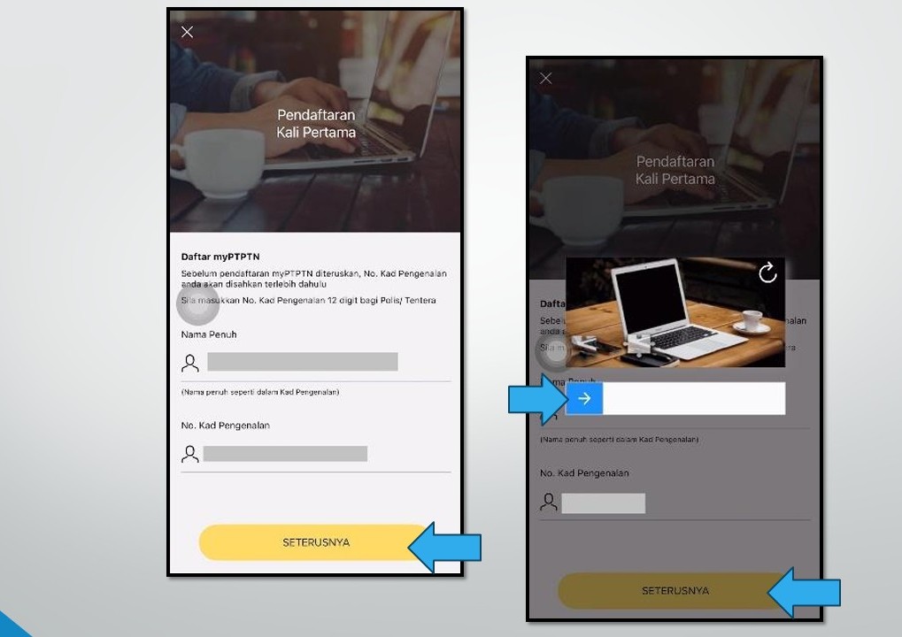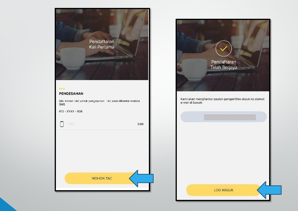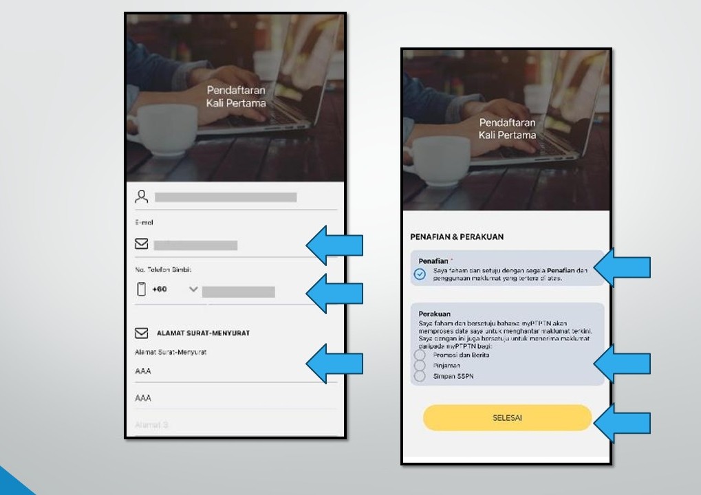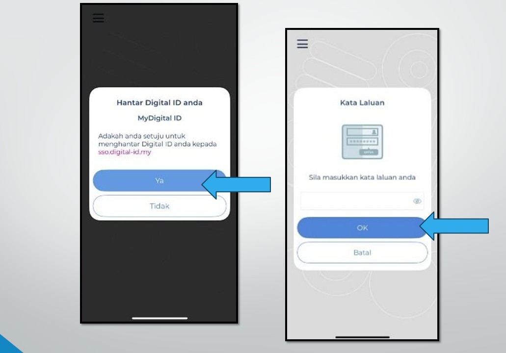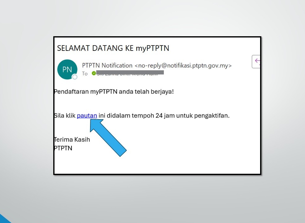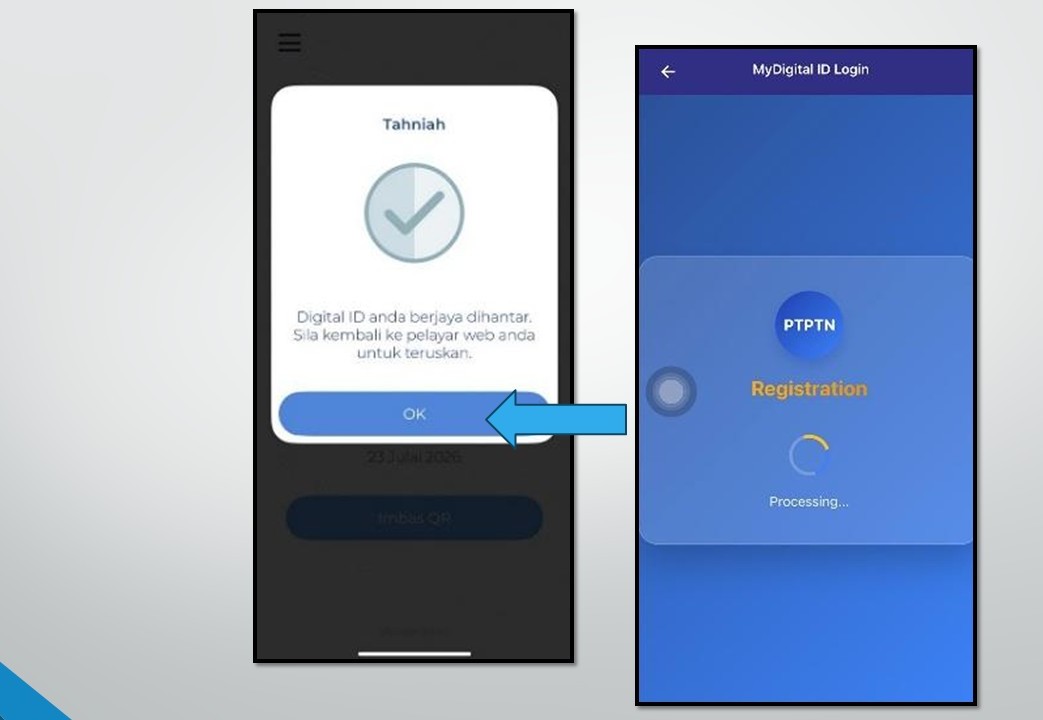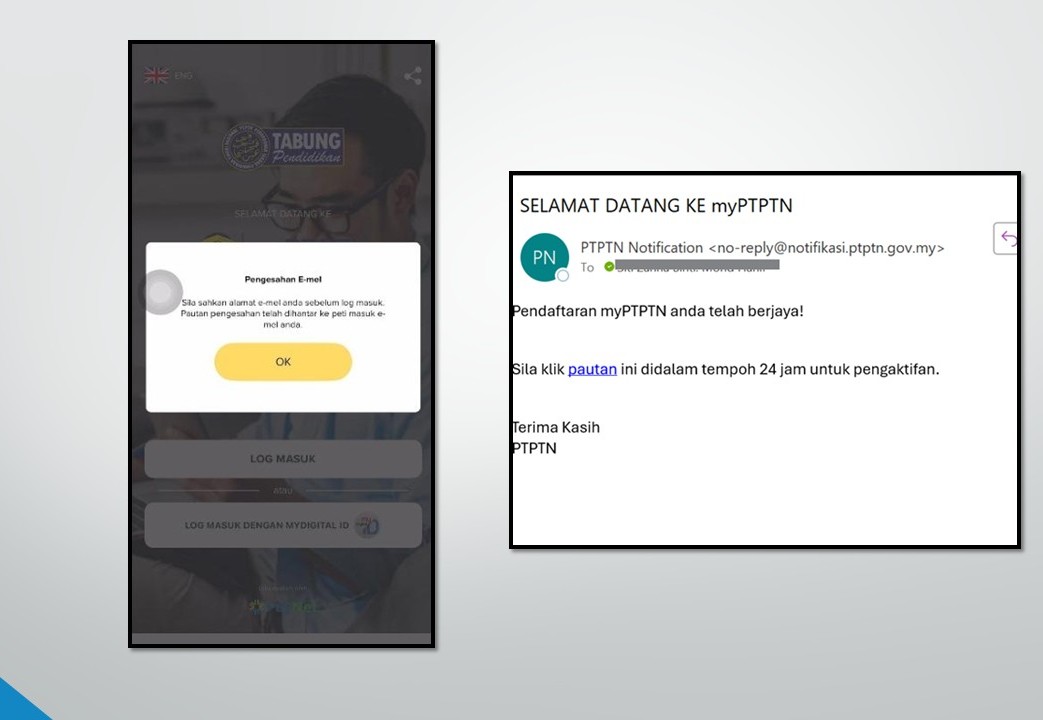 MAKLUMAN:Pastikan anda telah mendaftar MYDIGITAL ID sebelum ingin membuat pendaftaran aplikasi MYPTPTN. Sila KLIK SINI untuk pendaftaran panduan. Langkah 1 - Muat turun Muat turun aplikasi MYPTPTN. Klik dibawah mengikut peranti anda Langkah 2 - Daftar Tekan untuk log masuk melalui MyDigital ID. Langkah 3 - SSO Sistem akan memaparkan halaman Log Masuk SSO MyDigital ID untuk membuka aplikasi MyDigital ID Klik butang “Ya”. Langkah 4 - Pengesahan Log masuk di dalam aplikasi MyDigital ID bagi membolehkan anda meneruskan ke myPTPTN. Langkah 5 -Pengesahan Log masuk di dalam aplikasi MyDigital ID bagi membolehkan anda meneruskan ke myPTPTN. Langkah 6 - Pendaftaran Halaman pendaftaran myPTPTN akan dipaparkan selepas pengesahan identiti menggunakan MyDigital ID berjaya. Sistem akan memaparkan nama serta no kad pengenalan pengguna dan maklumat ini tidak boleh dipinda. Lerekkan captcha untuk proses seterusnya. Langkah 7 - Pendaftaran Lengkapkan maklumat pendaftaran yang diperlukan dan tekan butang ‘Seterusnya’ untuk halaman seterusnya. Langkah 8 - Pendaftaran Tekan ‘MOHON TAC’ untuk mendapatkan no TAC yang akan dihantar melalui SMS.Lengkapkan proses pengesahan TAC.Sistem akan memaparkan makluman pendaftaran berjaya selepas pengesahan TAC berjaya dilakukan. Langkah 9 - Selesai Pengguna perlu membuat pengesahan emel untuk pengaktifan akaun myPTPTN sebelum log masuk.Klik pada pautan di dalam emel pengesahan emel untuk pengaktifan akaun. Langkah 10 - Pendaftaran Popup akan dipaparkan semasa login menggunakan MyDigital ID jika pengguna belum mengaktifkan e-mel.Pengguna perlu membuat pengesahan emel untuk pengaktifan akaun myPTPTN.Klik pada pautan di dalam emel pengesahan emel untuk pengaktifan akaun. Langkah 11 - Selesai Pengguna boleh log masuk terus melalui myPTPTN app atau myPTPTN web. Jika masih ada masalah untuk pendaftaran diatas Sila hadir ke kaunter PTPTN Cawangan/Negeri yang terdekat untuk bantuan lanjut.
